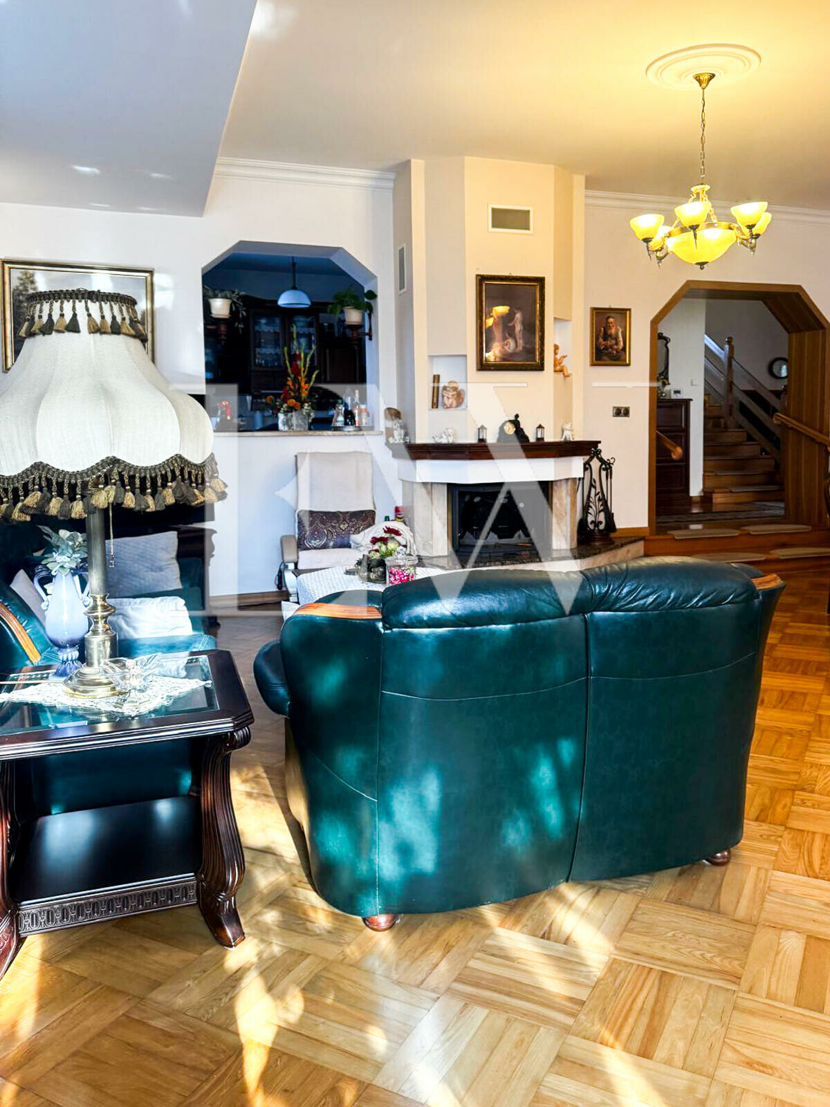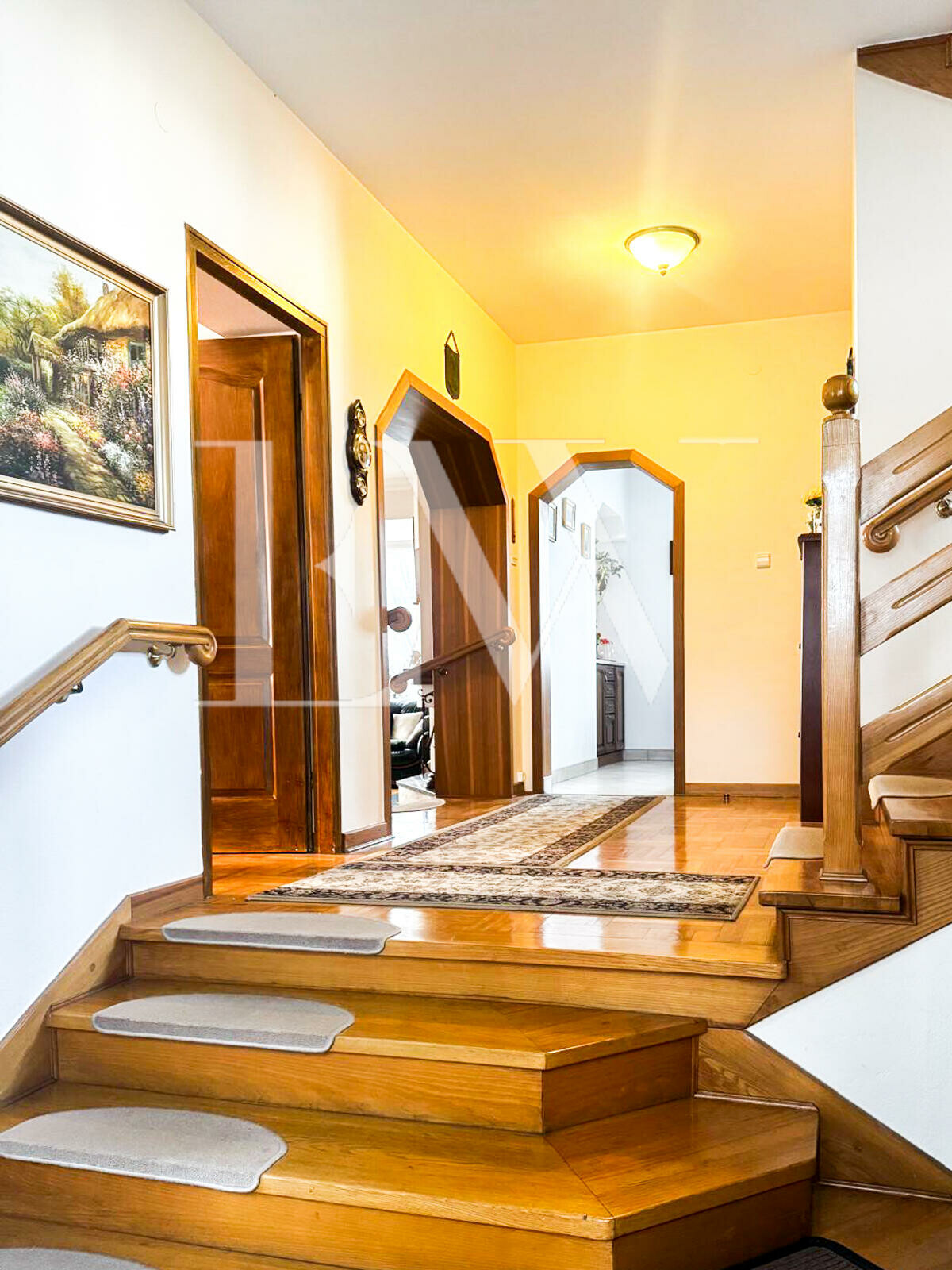 przestronny ganek prowadzący do holu, gabinet / pokój gościnny, samodzielna, widna kuchnia z dużym oknem i otwarciem na salon, salon o powierzchni ok. 48 m² – pięknie doświetlony, z wyjściem na taras i ogród, łazienka z prysznicem i dużym oknem, na podłodze i schodach elegancki złoty jesion.