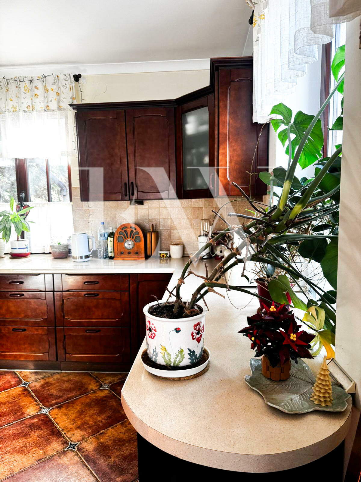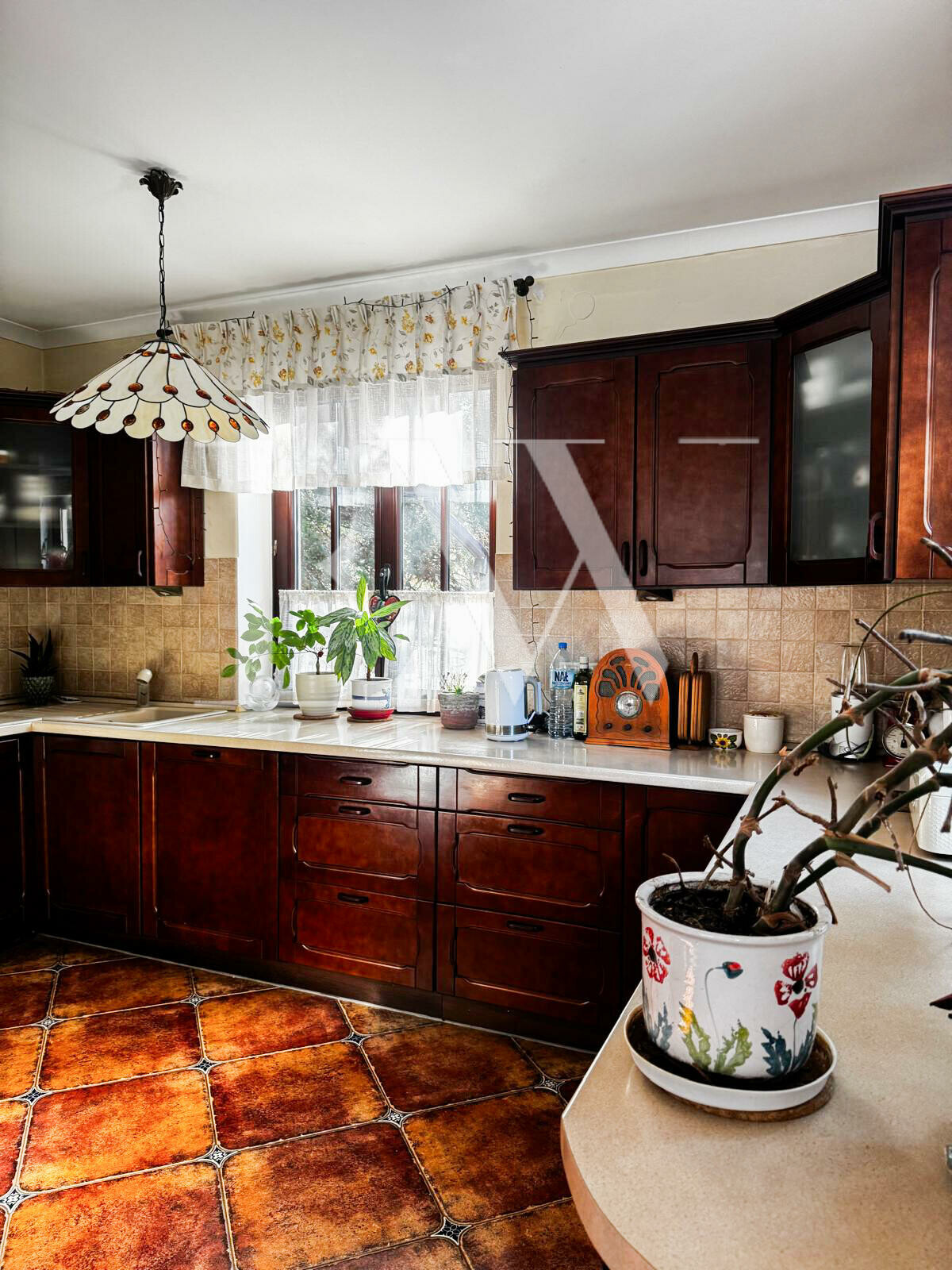 Kuchnia wykonana na zamówienie przez stolarza (drewno), podobnie jak zabudowy garderób oraz szafki w kotłowni. Sprzęt AGD obejmuje m.in. płytę gazową i piekarnik elektryczny marki Smeg, zmywarkę w zabudowie Bosch oraz pralkę wolnostojącą Bosch.