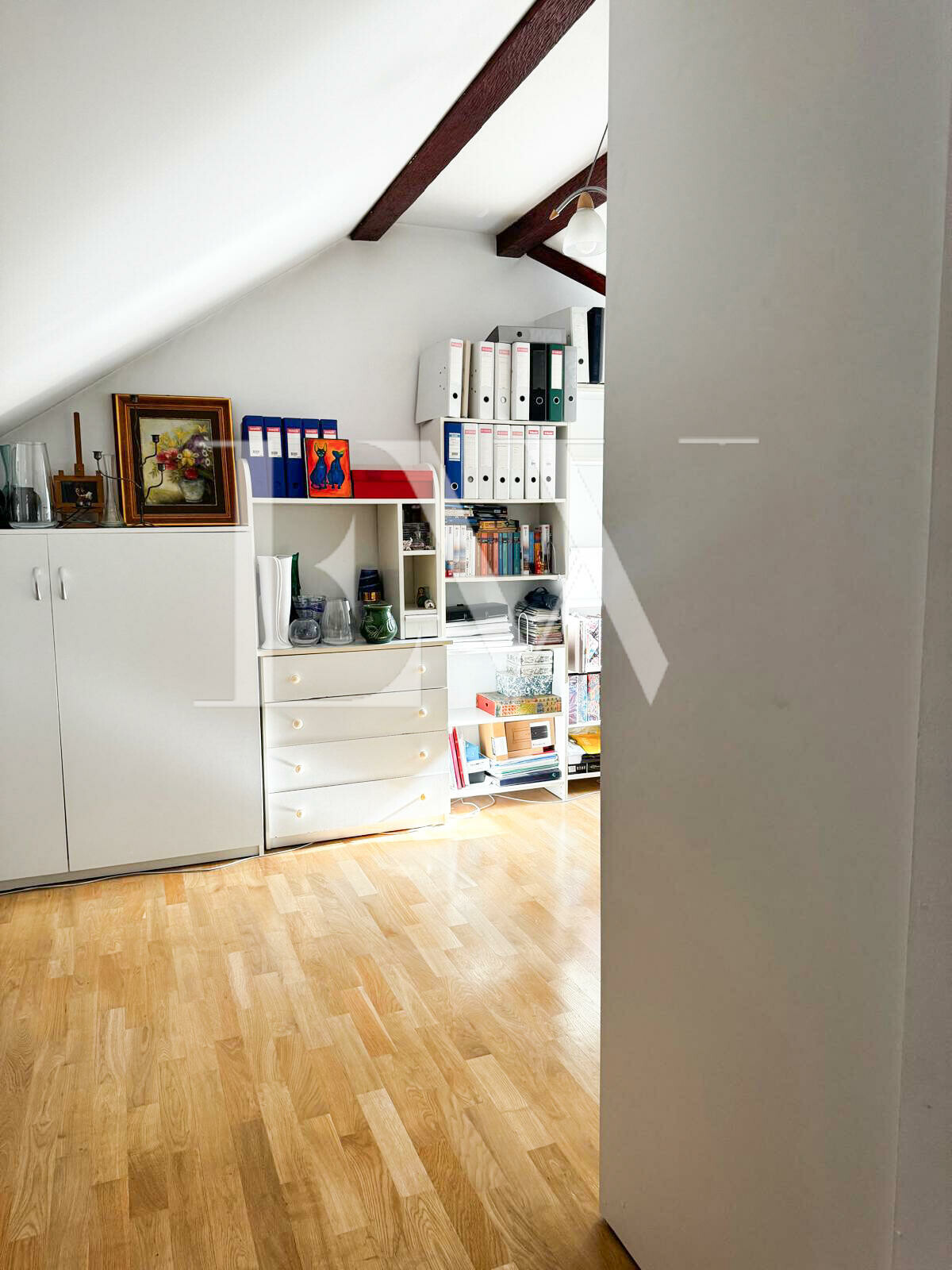Dach wykonany z pełnym deskowaniem, pokryty papą oraz dachówką ceramiczną. Strych ocieplony wełną mineralną i wykończony. System rynnowy z podbiciem.